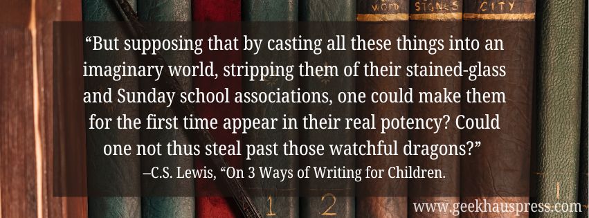 “On that side (as Author) I wrote fairy tales because the Fairy Tale seemed the ideal Form for the stuff I had to say. Then of course the Man in me began to have his turn. I thought I saw how stories of this kind could steal past a certain inhibition which had paralysed much of my own religion in childhood. Why did one find it so hard to feel as one was told one ought to feel about God or about the sufferings of Christ? I thought the chief reason was that one was told one ought to. An obligation to feel can freeze feelings. And reverence itself did harm. The whole subject was associated with lowered voices; almost as if it were something medical. But supposing that by casting all these things into an imaginary world, stripping them of their stained-glass and Sunday school associations, one could make them for the first time appear in their real potency? Could one not thus steal past those watchful dragons?” –C.S. Lewis, “On 3 Ways of Writing for Children.”