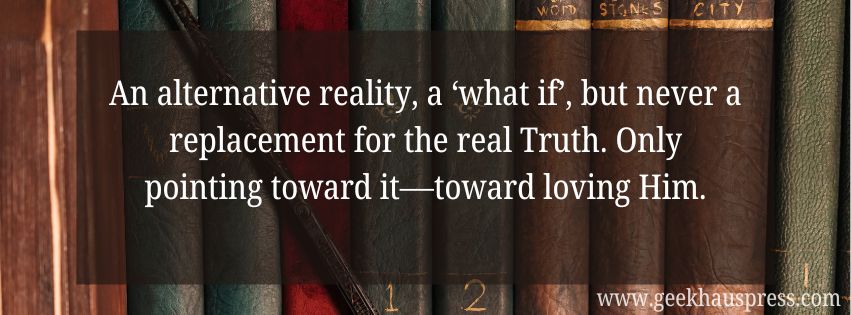 Now, Christians are allowed to write a great stories that have no or little explicit reference to God, Christianity, or the Bible. And that’s totally fine! We do need just plain good books—engaging stories with beauty, truth, that uplift and delight in their entertainment. And, no, they don’t have to be fluffy and can absolutely achieve these goals while wrestling with hard and even dark themes. Case in point are the many classics that manage to achieve this, starting with The Lord of the Rings!